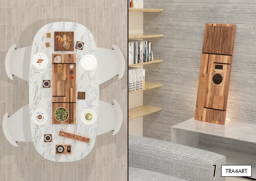 TRA4ART rappresenta la ricerca di presentare un oggetto (con un nome palindromo che si estende anche al suo carattere) che allo stesso tempo sia multi-funzionale, pratico da trasportare e che si possa posizionare in modo strategico ed utile al suo scopo. Esso è un quadro da appendere, un tavolo porta oggetti o composto-da-oggetti, un piano d’appoggio per elementi cari alla più consueta cucina casalinga o da aperitivo ed anche un oggetto da porre in spazi da arricchire con un nuovo tipo di design.