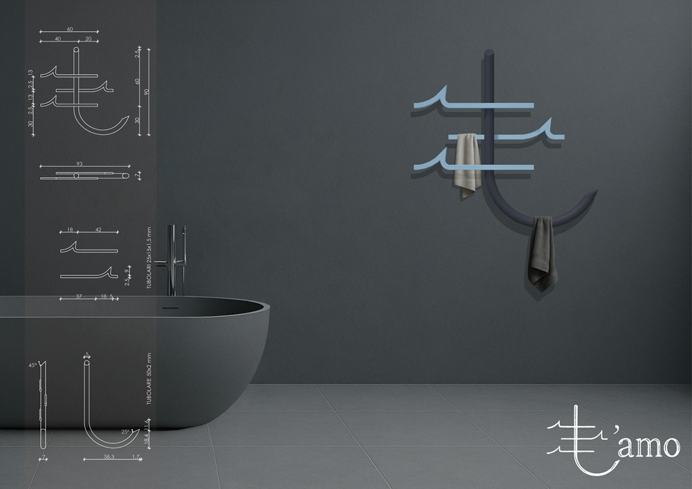 T’amo nasce dall’idea di proporre uno scaldasalviette destinato non solo all’ambito hospitality (hotel, resort, relais, ecc) ma anche a tutti quelli in cui vi è necessità di un arredamento ricercato che sia capace di coniugare resa estetica e funzionale mantenendo una sua originalità; tra essi viene compreso quello privato. A partire dal nome stesso, infatti, viene fusa assieme la parola “amo” con due accezioni diverse: da un lato un richiamo alla sua forma, dall’altro alla forte emozione dell’amore.